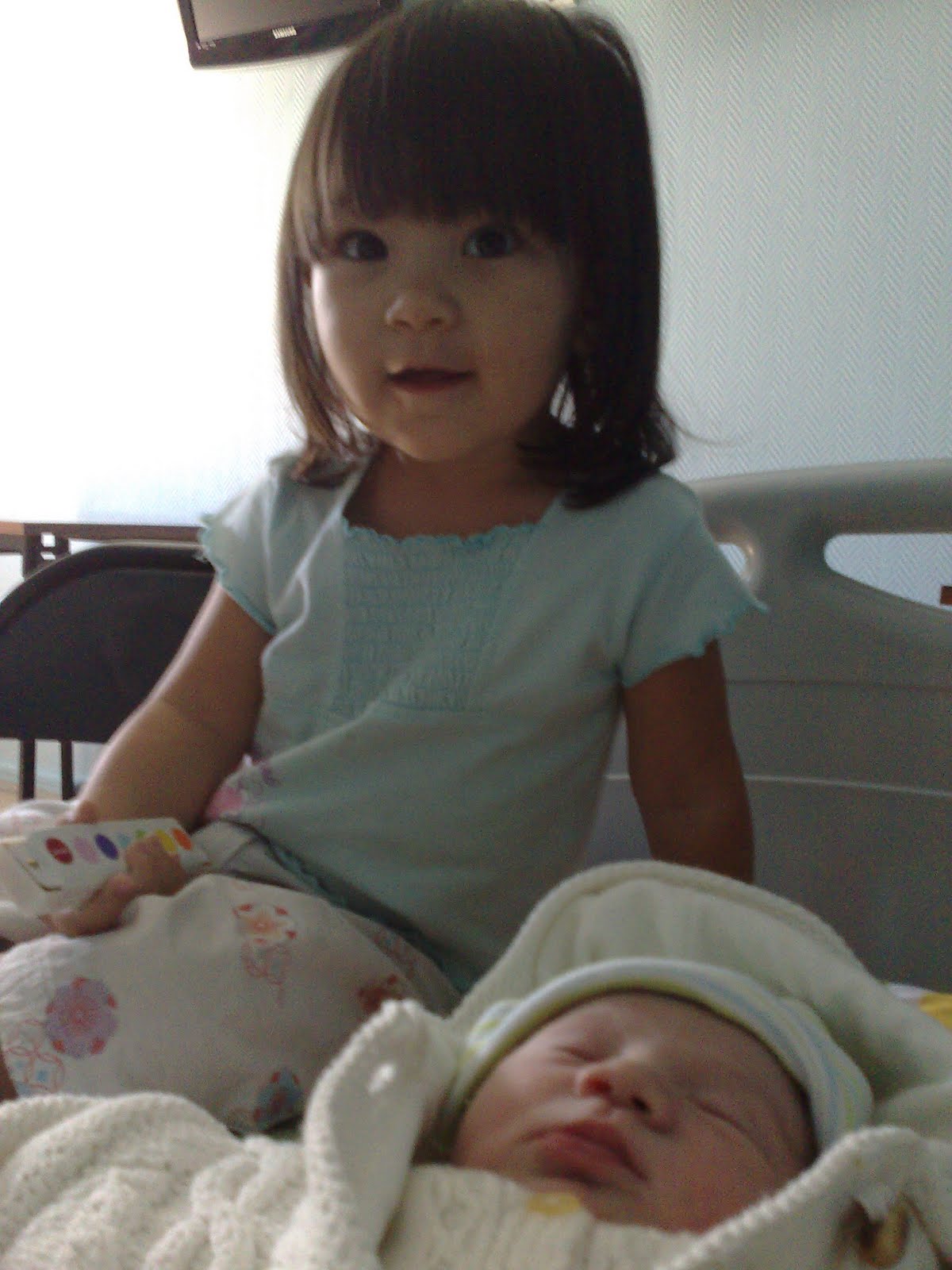 寶弟最後是有點意外的,比預產期早了三週來臨。八寶看著開始陣痛的我,有點憂慮的皺起眉頭,摸摸我的手臂,輕聲叫馬麻。到醫院之後,除了全然放心的把八寶交給爸爸,自己專心的進產房生產,別無選擇。等生產完,在產房觀察了兩小時之後,回到病房裡,八寶正跟爸爸和瑪歌去午餐;等我們再見面,她就見到我懷裡的弟弟。她很高興再看到媽媽,對於終於見面的弟弟,她有一點驚喜、有一點陌生。怯生生的摸了一下弟弟,之後,就把注意力又轉回到媽媽跟病房這個空間。吃媽媽的午餐、碰所有房間裡的東西、打開所有寶寶的用品。。。